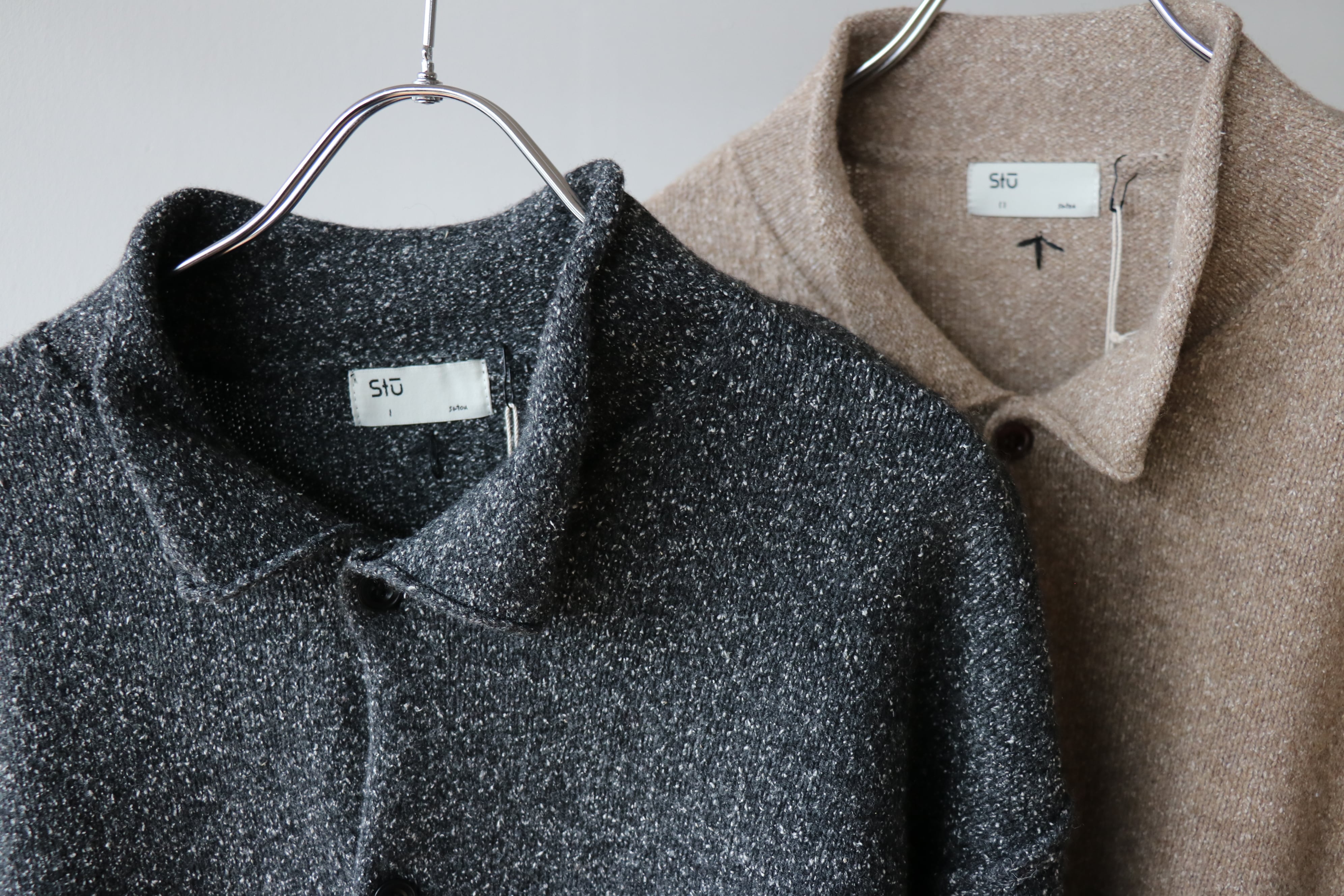 メリノウール+シルクの糸を使用、スタンドネックタイプのカーディガンです。