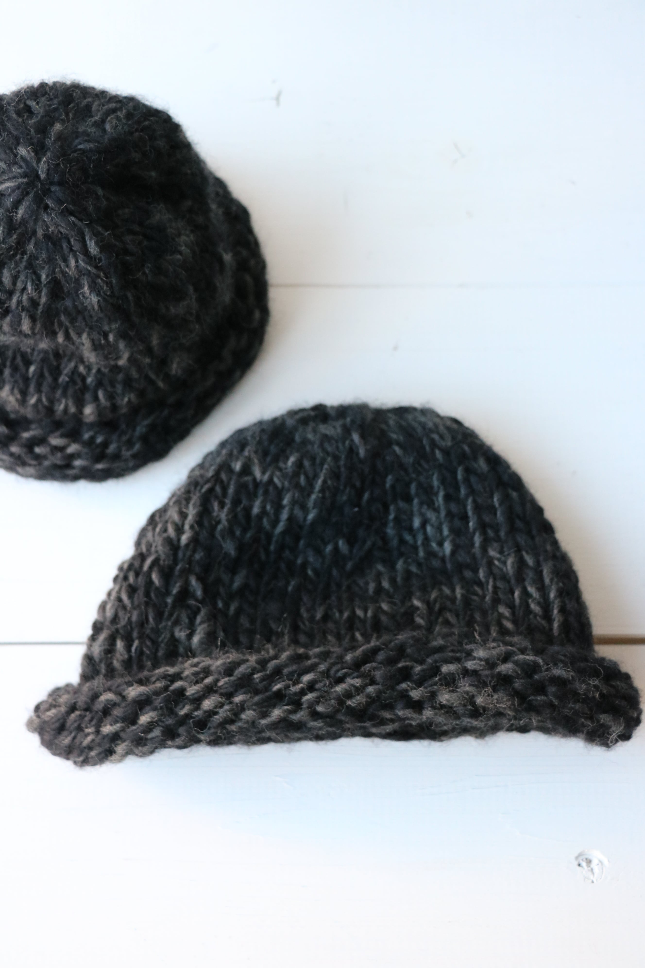 ウール糸で編み立てたハンドメイドのニットキャップ。