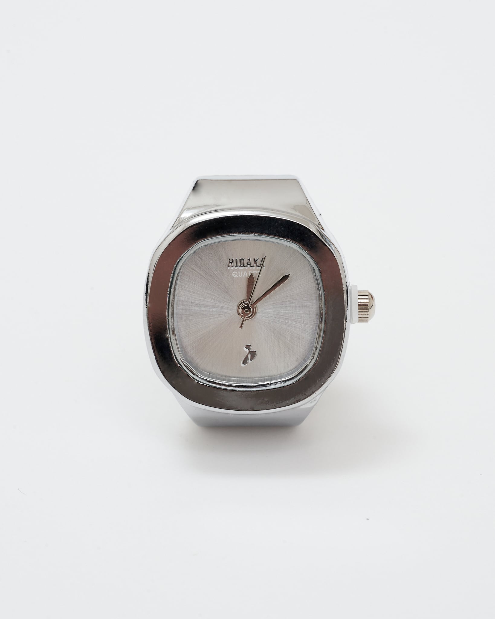 ヴィンテージの時計をサンプリングしてデザインしたリングウォッチ。指につける時計という新しい形態で実用性と装飾性の境界を探った新しいジュエリーです。縮小されたデザインは機能的でありながらもシュールで日常の中に存在感を放ちます。伸縮性のベルトで11号〜20号程度まで指に合わせて装着可能です。