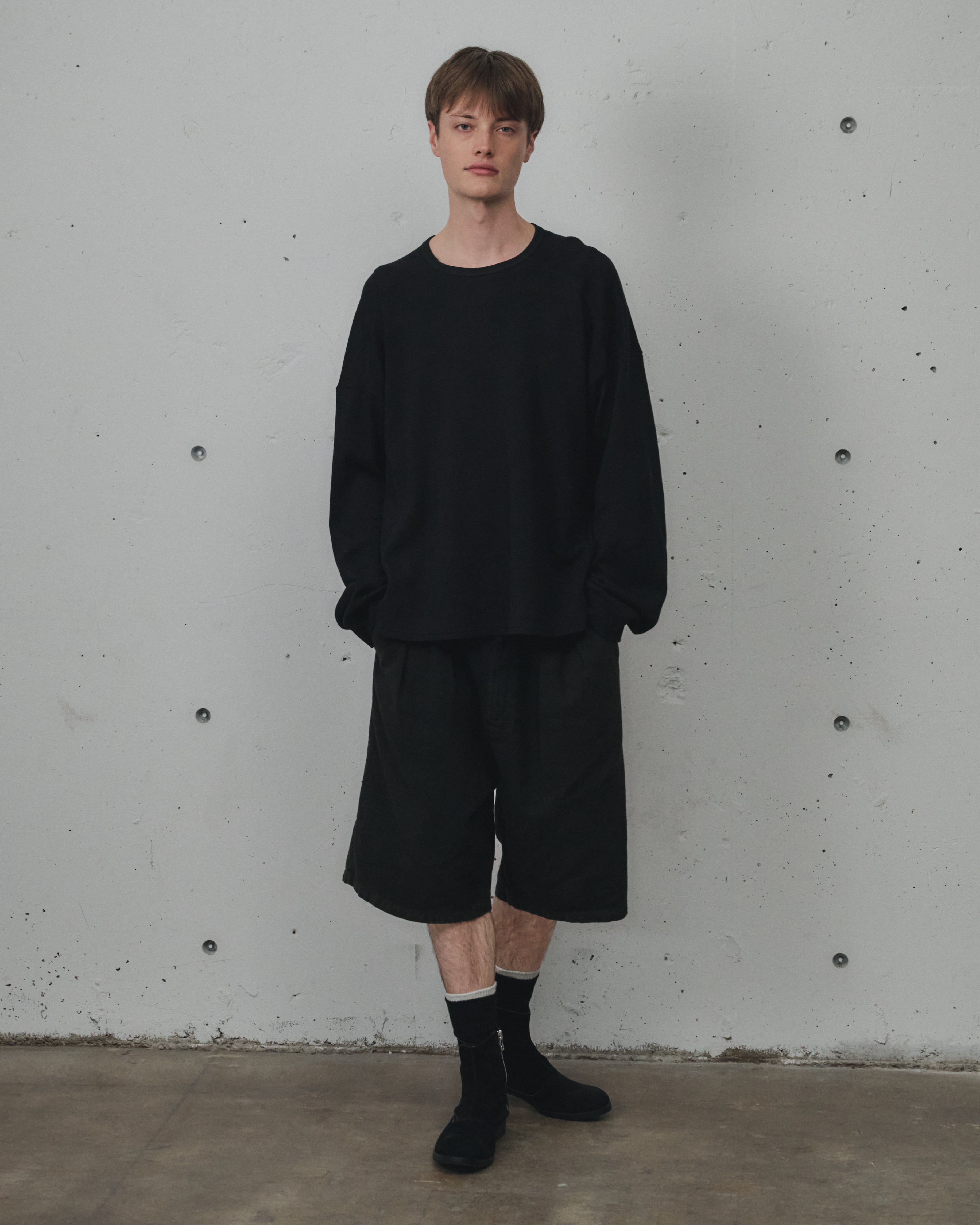 身幅を大きく広げることで美しいドレープから陰影が生まれ、太いアームをやや長めに取り付けることで、袖先でたっぷりと生地が溜まります。着心地にゆったりとゆとりを設け、身体への接触が少なく風を取り込むようなパターン。気温が上がってからも一枚で気持ち良く、着用時期の長い使い勝手を目指しております。