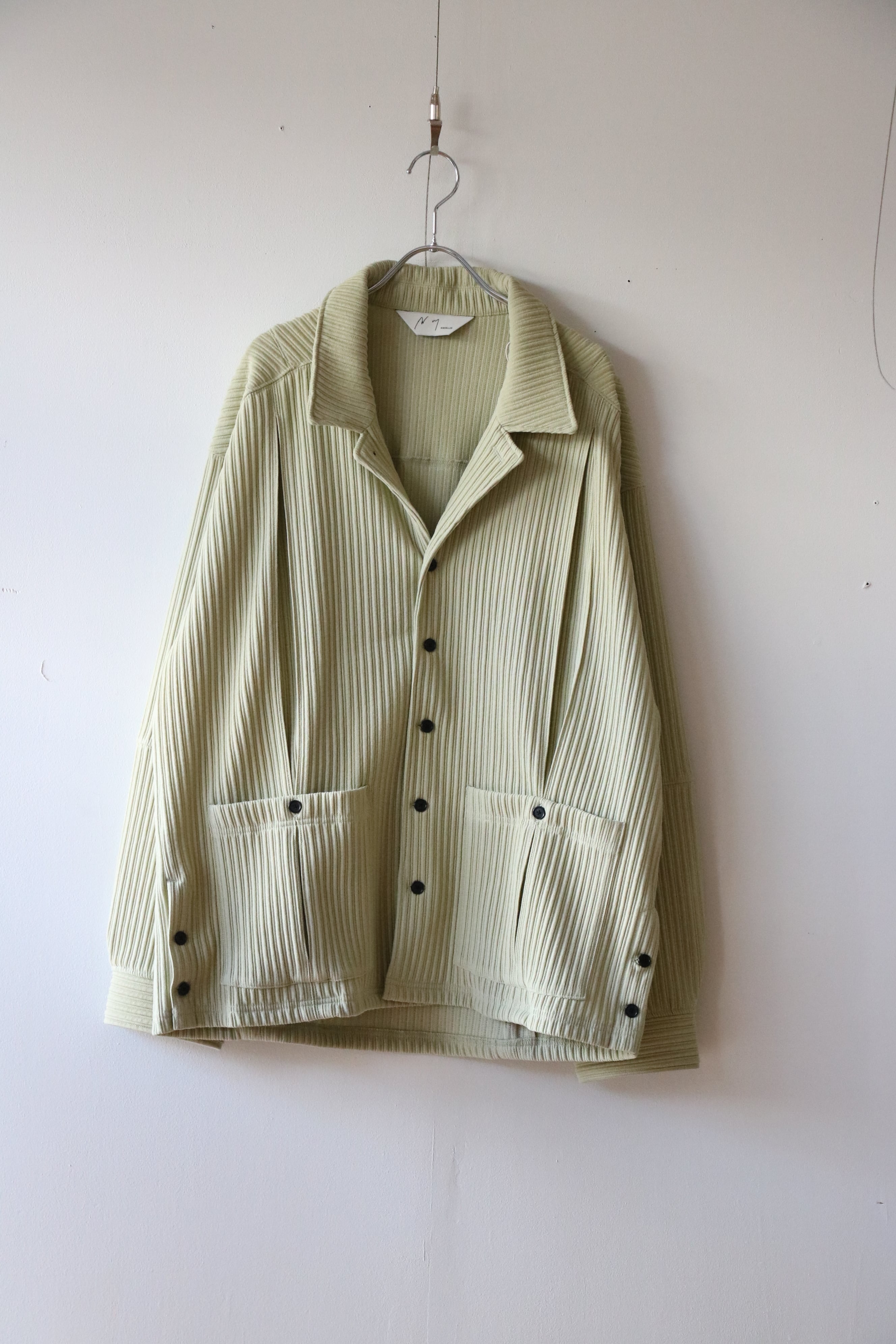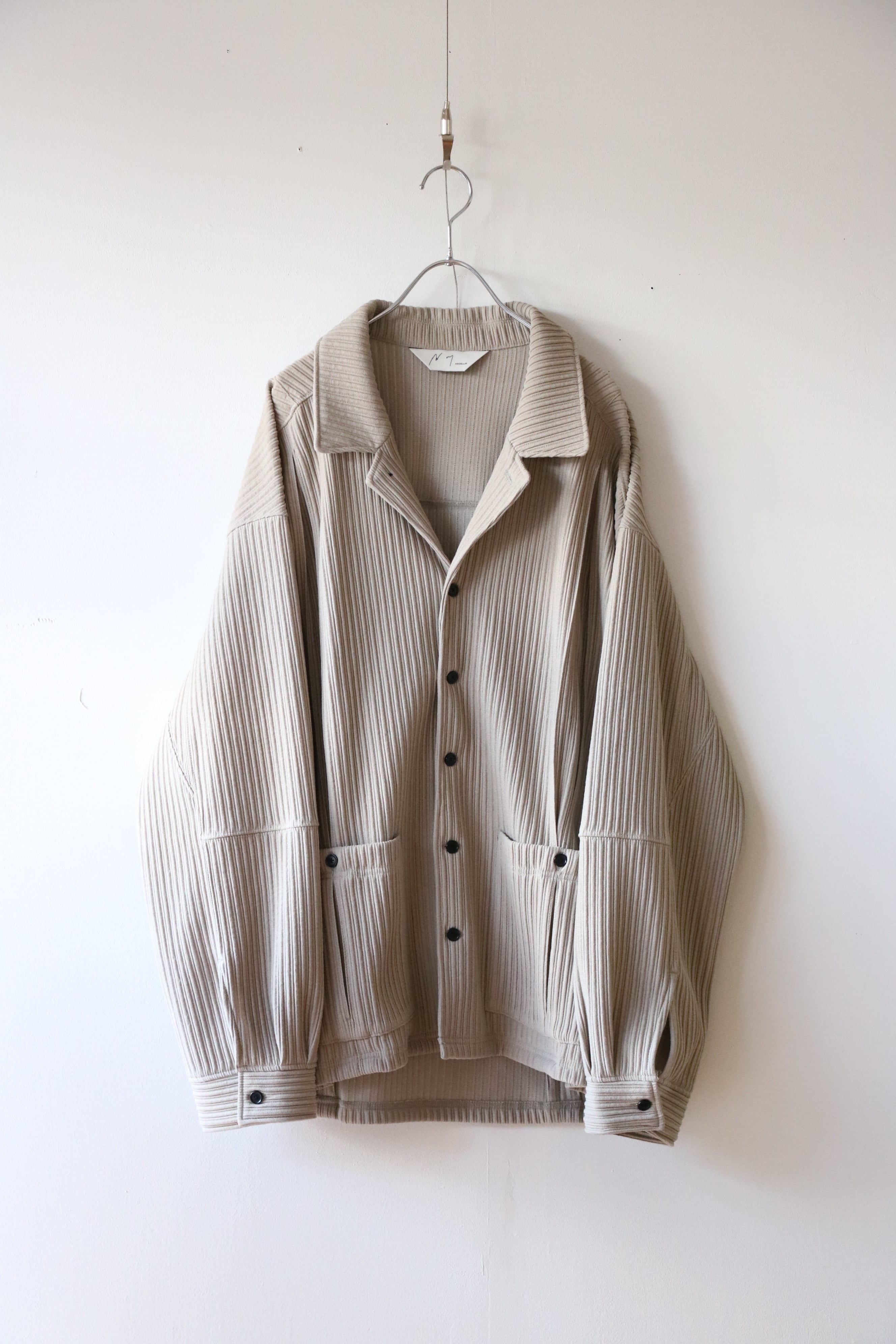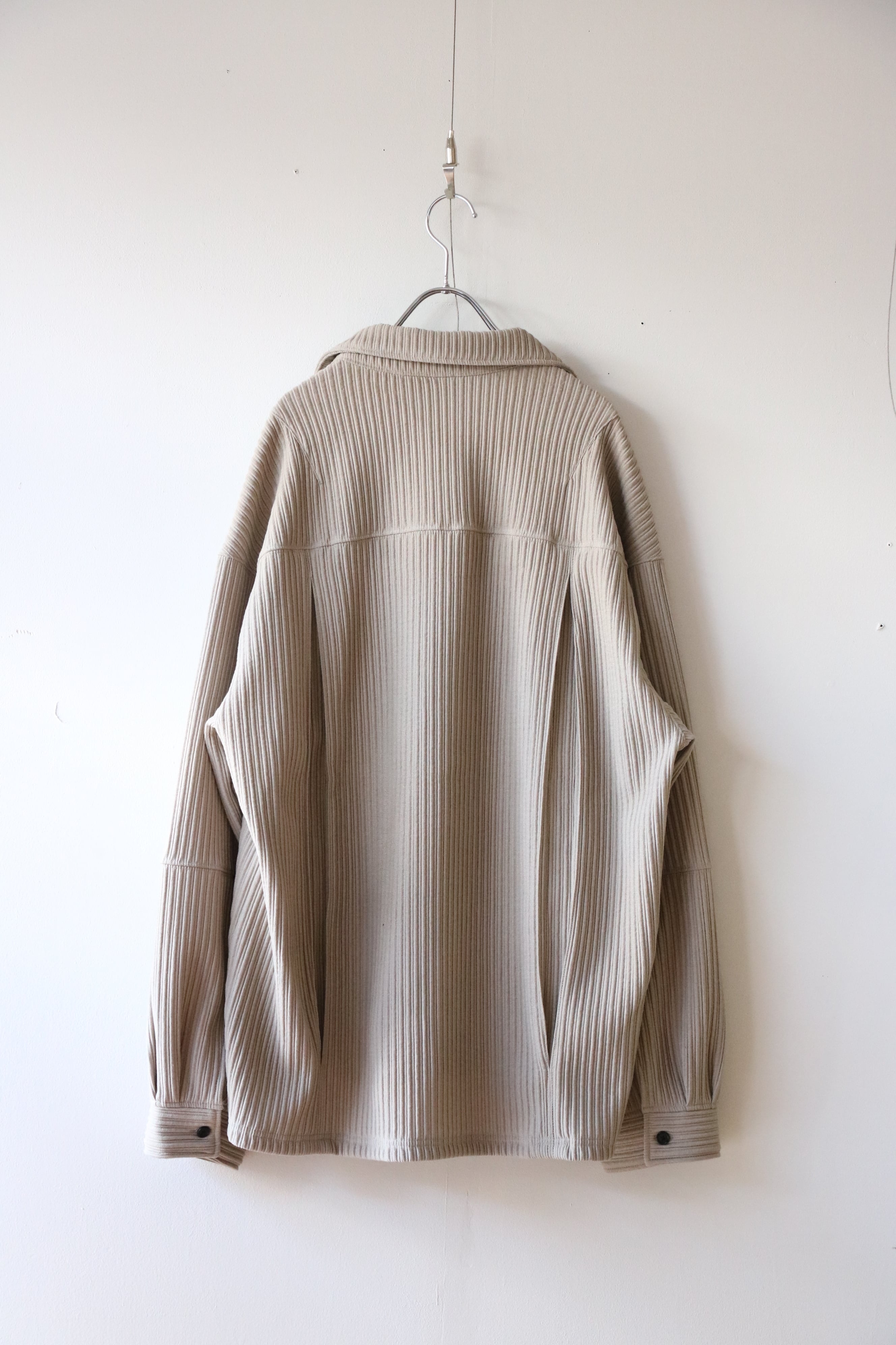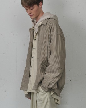 畝をストライプに見立てながら、立体感の強い生地に合わせて形状はシンプルに設計。シャツとカバーオールの間を取り、羽織りとしてもお使い頂ける量感を狙いました。