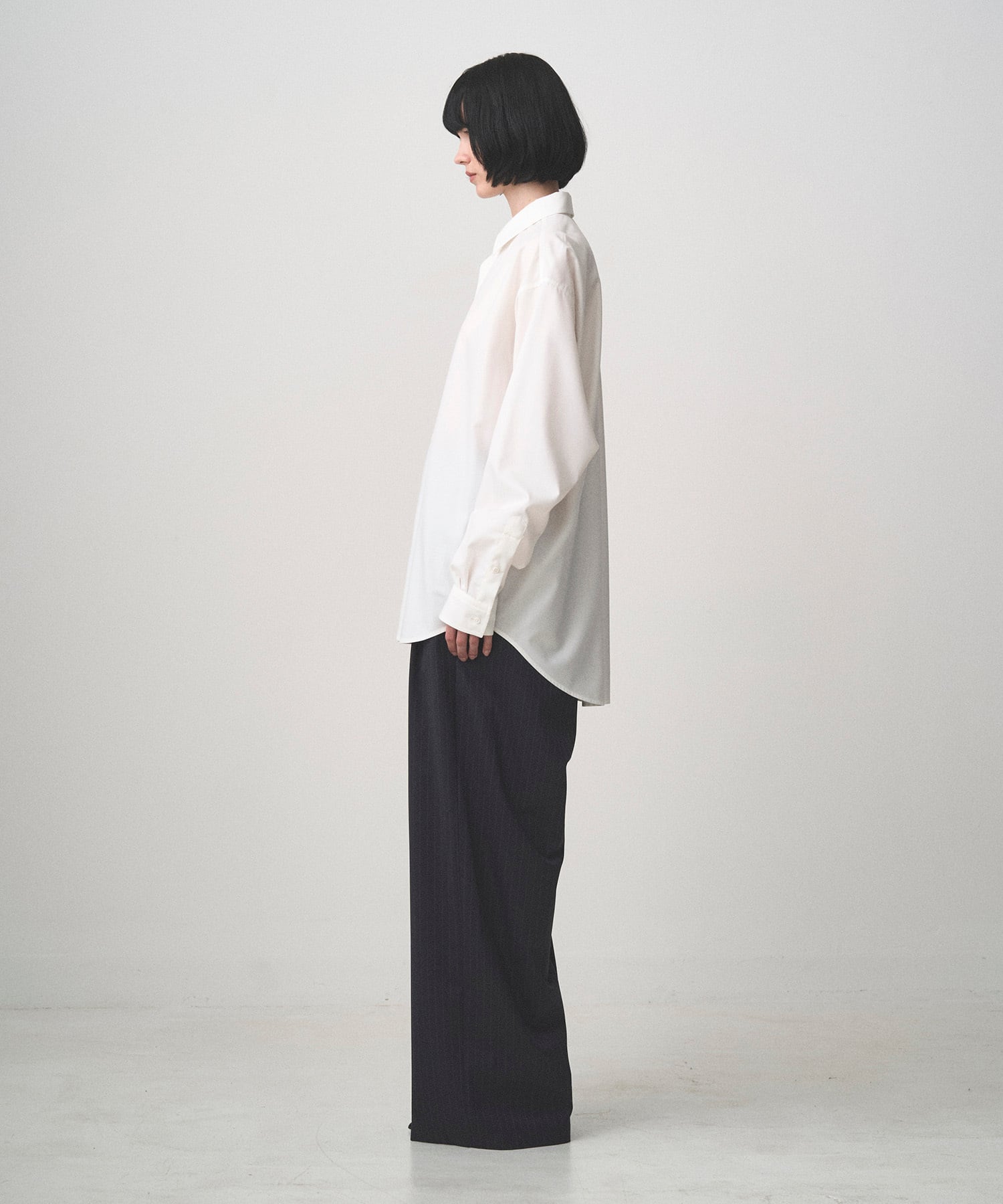落ち感のある素材を活かし、身幅にゆとりを持たせたワイドシルエットで構成しています。
