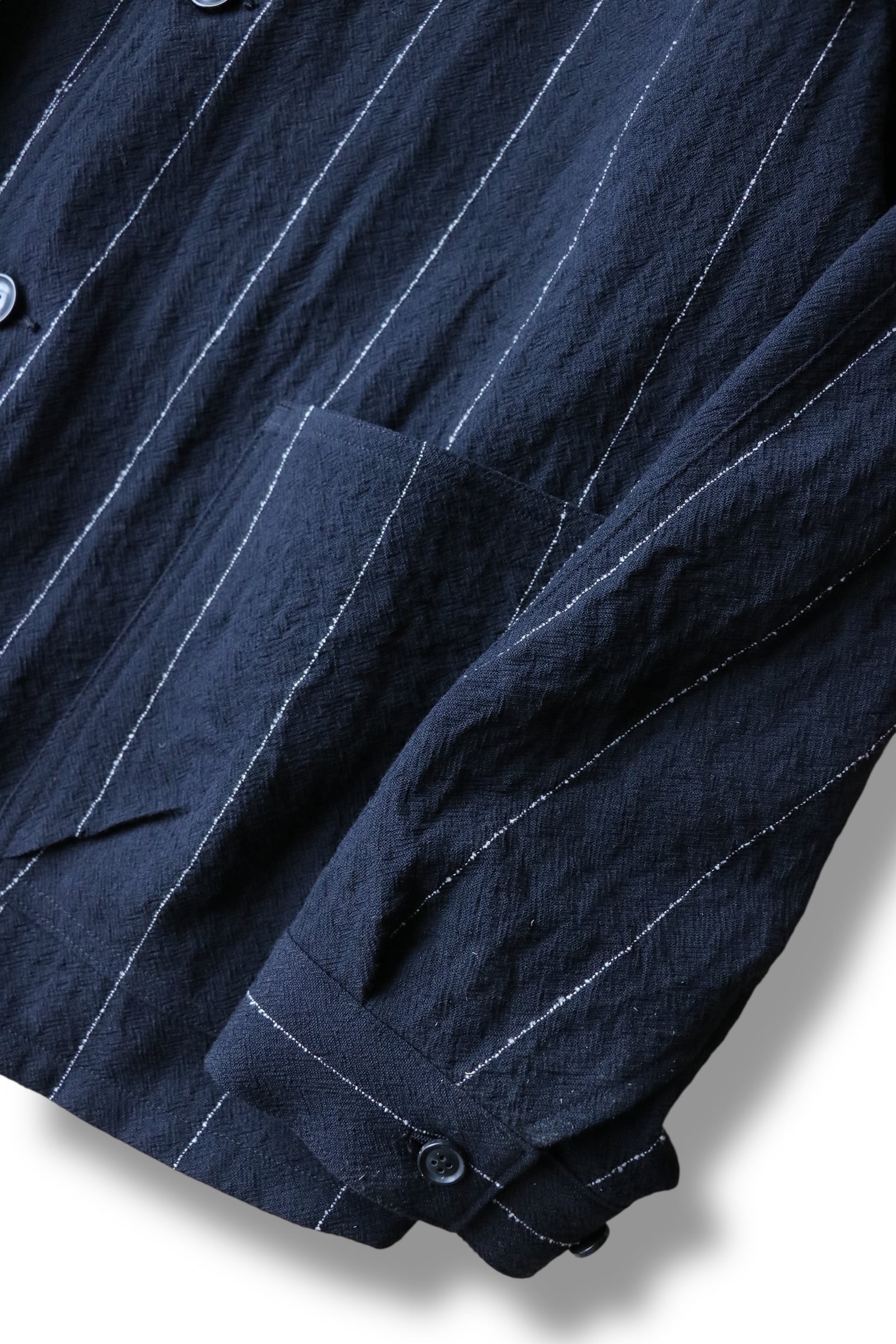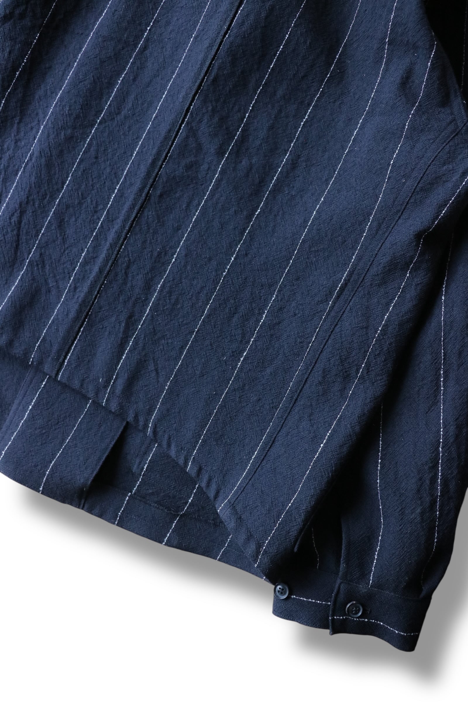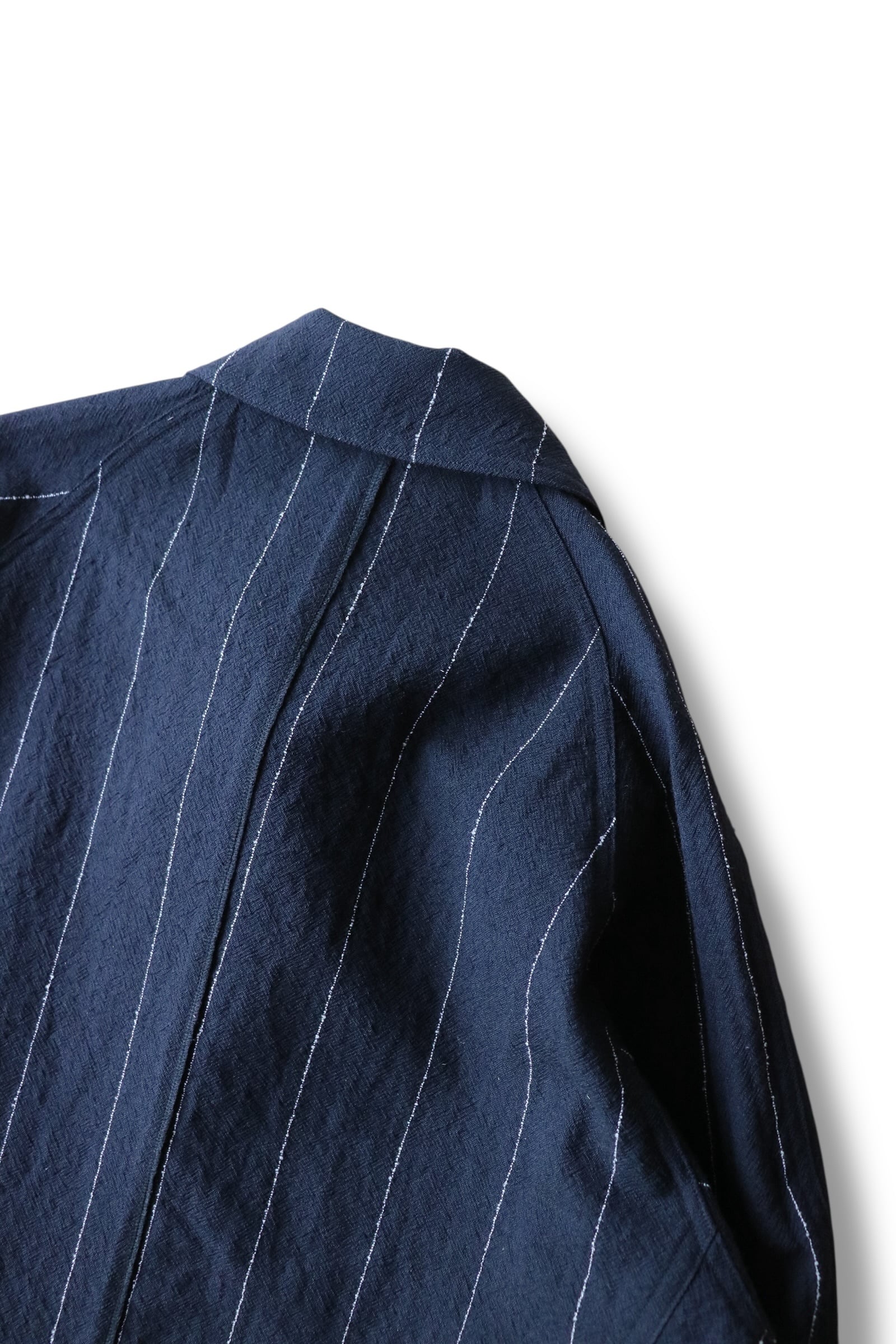生地は塩縮加工を施したウール素材。加工により生地に立体感が生まれ、肌離れが良く、春夏に最適な素材です。