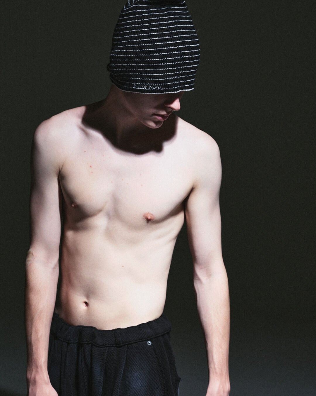 時間の経過による劣化を Raw Edge= 解れた端で表現したレイヤード風パンツ。