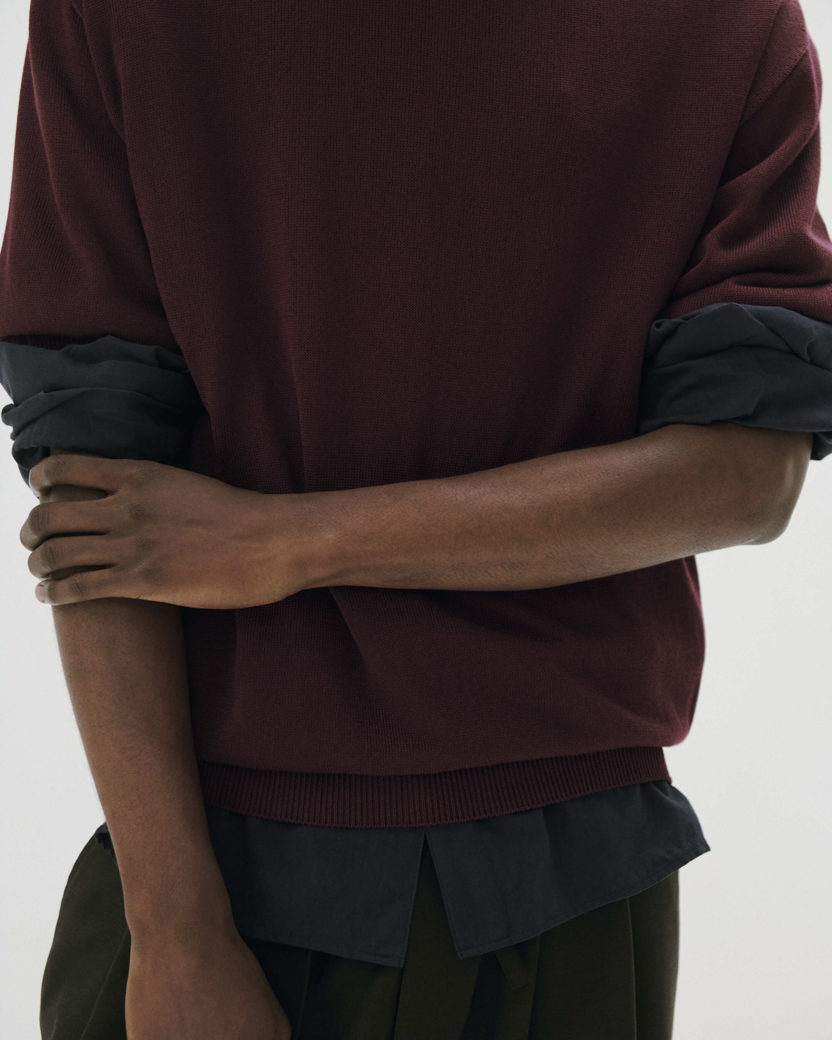 よりニットらしさを持たせるために、襟付けはダブルのリンキングで強度を持たせ、裾と袖口には 適度なテンションのリブが付属します。